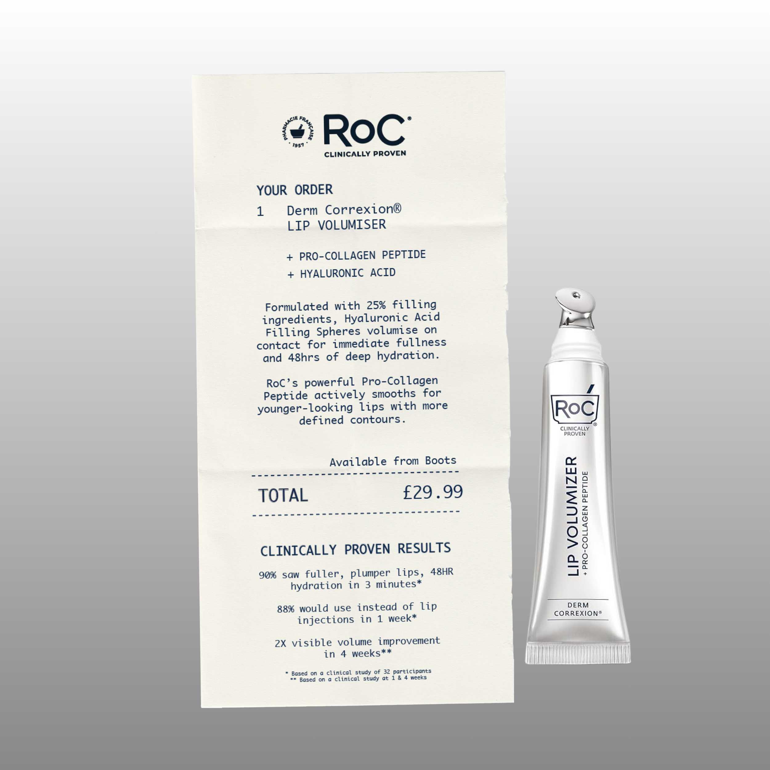 Packaging: The Lip Volumiser was presented in a silver prescription-style bag, with the RoC logo on both sides and the playful tagline: “Tear here for a plumper pout in 3 minutes.”