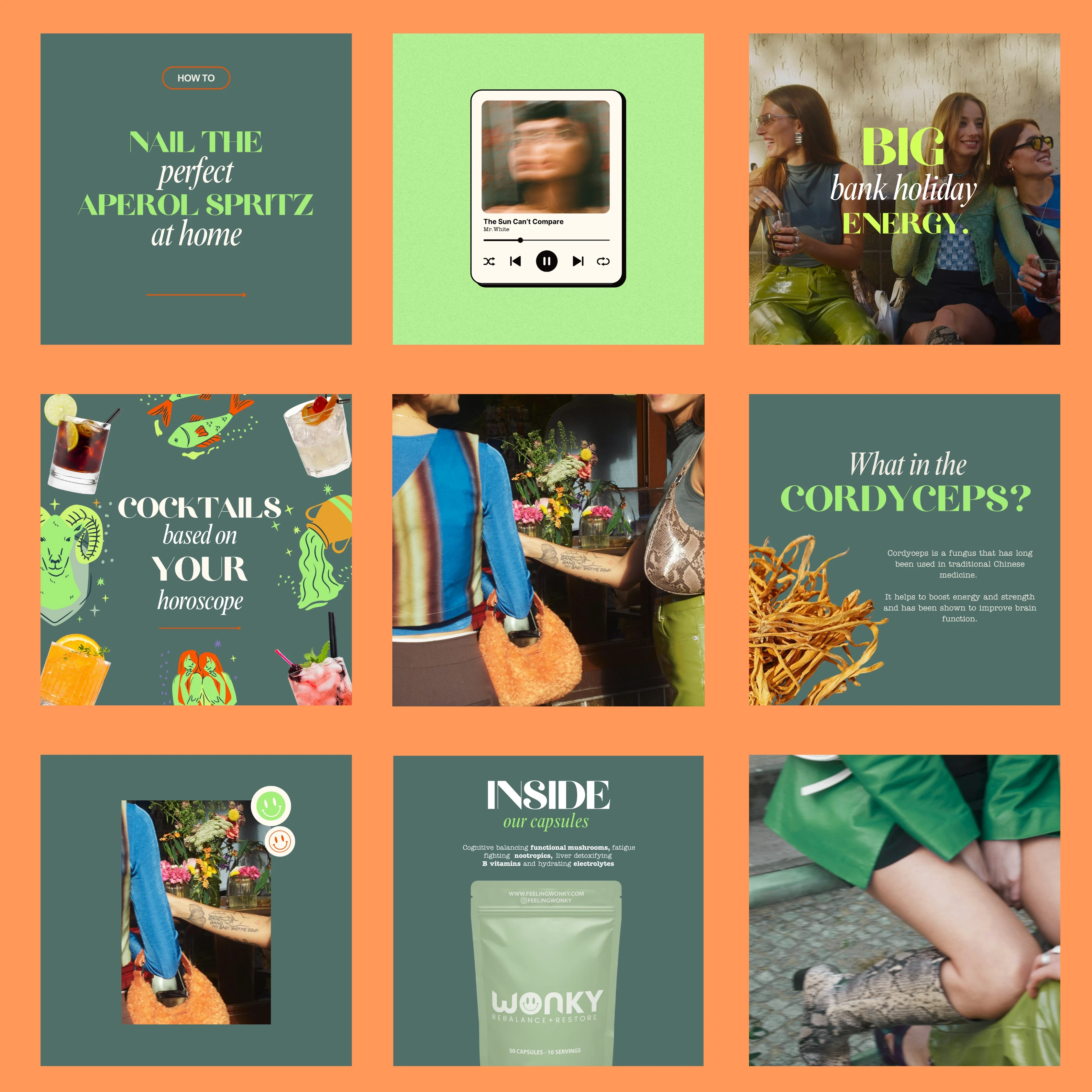 Wonky’s brand identity boldly steps away from the clinical wellness norm, creating a vibrant space where health meets fun. With a voice that’s confident, a visual style that’s dynamic, and a strategy that taps into cultural moments, Wonky is more than a supplement—it’s a vibe. The brand now speaks fluently to its audience, helping them feel better without feeling bad.